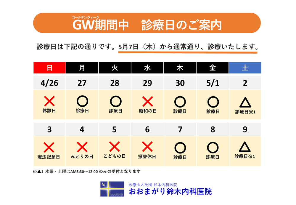 ゴールデンウイーク期間中 診療日のご案内 いつもおおまがり鈴木内科医院をご利用いただきありがとうございます。 ゴールデンウイーク期間は、令和8年(2026年)5月3日(日)〜令和8年(2026年)5月6日(水)の期間は、休診といたします。 令和8年(2026年)5月7日(木)より通常診療を開始いたします。 ご迷惑をおかけいたしますが、よろしくお願いいたします。 クリックするとPDFがひらきます